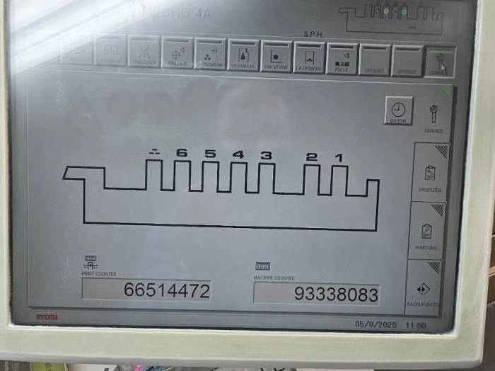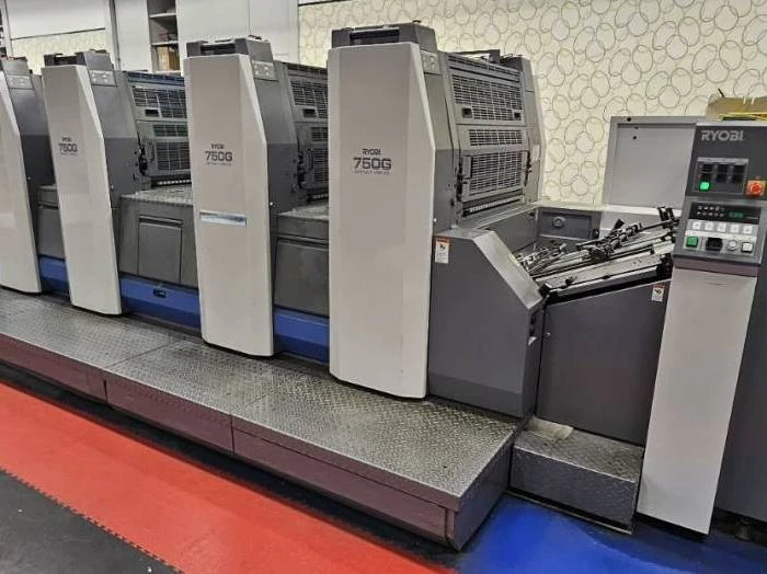 Ryobi 756GP is a 6-color offset printing press equipped with an inline UV varnish and IR drying system, manufactured in 2012. The machine is located in Western Europe, currently in production, and available immediately. Designed for high-quality, efficient commercial printing, the press offers both straight and perfecting printing modes with a maximum sheet size of 788 × 600 mm (31.02″ × 23.62″) and a maximum printing area of 765 × 545 mm (30.12″ × 21.46″). It can handle paper thicknesses ranging from 0.04 to 0.6 mm and achieves production speeds of up to 16,000 sheets per hour.